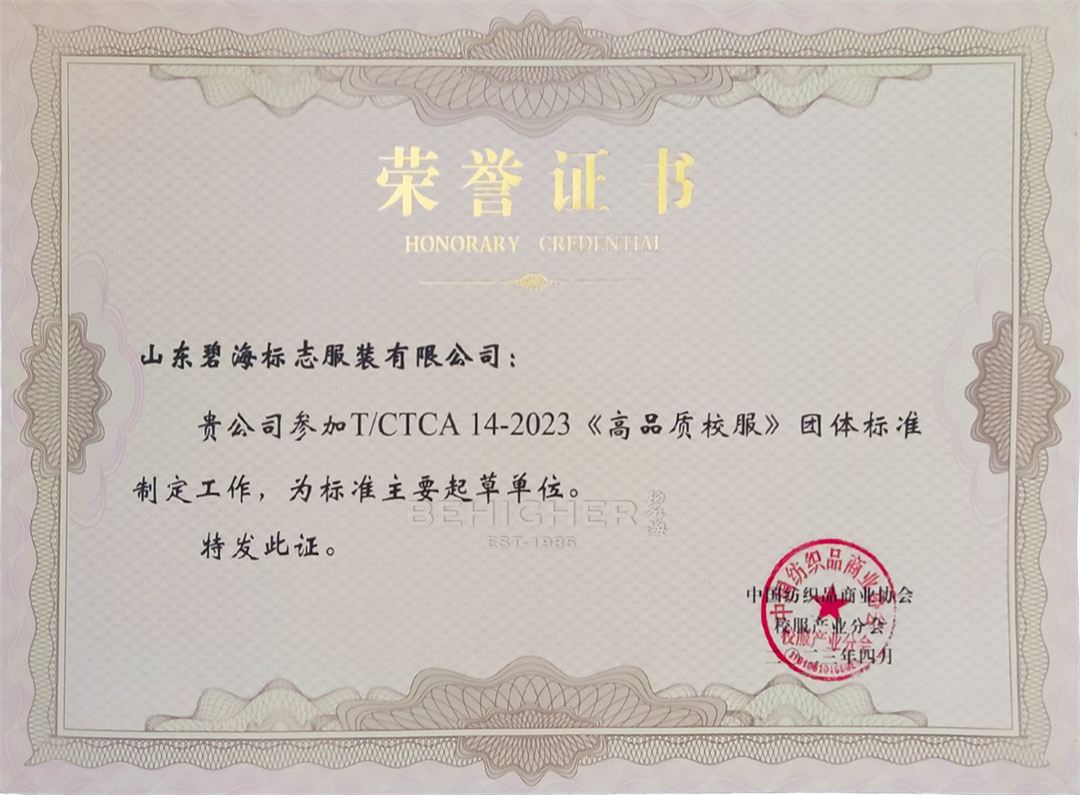 2023年4月,#中國紡織品商業協會校服產業分會#,向T/CTCA 14-2023《#高品質校服#》團體標準制定工作中的相關單位頒發榮譽證書。#碧海服裝#作為校服行業標準化發展的參與者和推動者,積極參與了T/CTCA 14-2023《高品質校服》團體標準的起草工作,為標準主要起草單位。T/CTCA 14-2023《高品質校服》團體標準于2023年3月4日在溫州召開了審定會,相關專家和企業負責人參與...